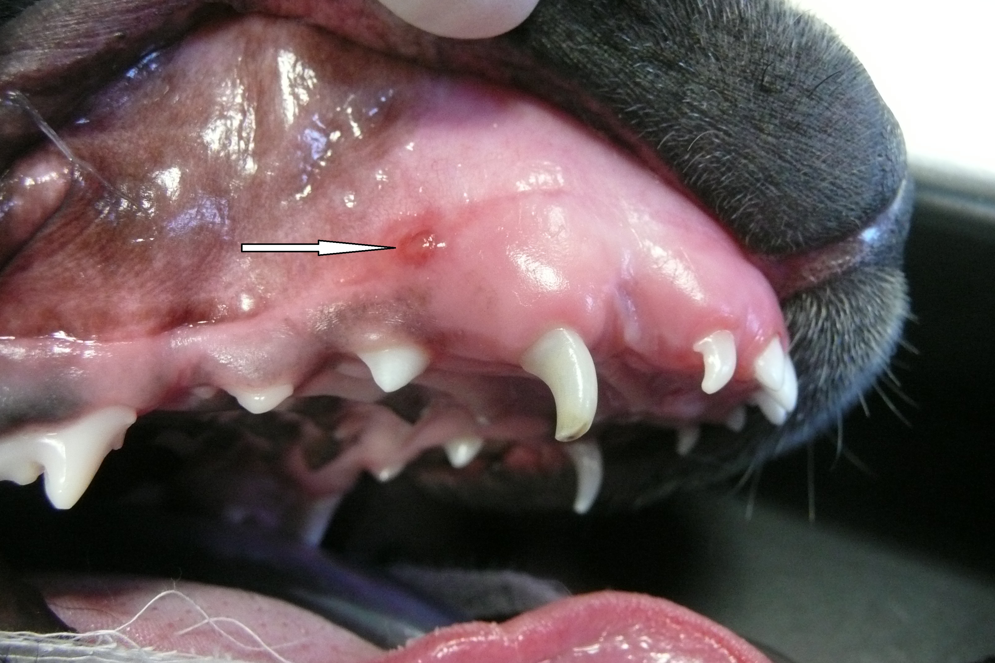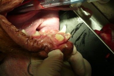 Fracture of the right madibular canine. In this case, the open pulp chamber is clearly visible and the fracture extends below the level of the gum